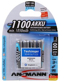 Ansmann have produced the highest capacity AAA rechargeable batteries available. These 1100mAh AAA rechargeable batteries from Ansmann are the optimum energy source for all modern electronic equipment: Digtal cameras, flashes, MP3 players and electronic toys. These batteries are good for the environment and for the "purse", because one rechargeable battery is able to replace hundreds of alkaline batteries. Another advantage is that equipment with extremely high current demands such as digital cameras and flashes, work faster and longer with rechargeable batteries than with any type of alkaline batteries!