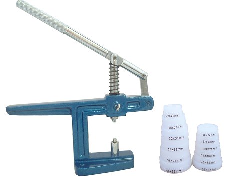 This lever back press is for fitting watch glasses and the backs of snap-on watch cases. Supplied complete with 6 double-sided flat and 6 double-sided recessed (or cavity) dies. The recessed dies protect the watch glass when it is placed face down whilst the back is pressed in to place with the flat die, as the lever is depressed. There is a locking screw to hold the press shut when not in use.