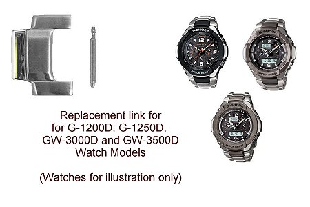 Genuine Casio additional watch link for adjusting watch bracelet length. This watch link is for the G-1200D, G-1250D, GW-3000D and GW-3500D watch bracelets on the the following variants:
