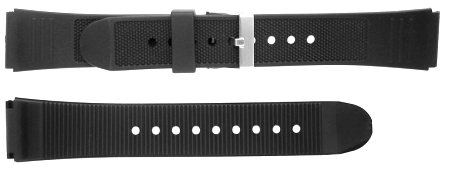 A slim profile black resin watch strap with ridged underside and top cross-hatch design. A sturdy but flexible all weather sports strap in 18mm and 20mm fittings. The shoulder width of these straps is 22mm in both width fittings. Chrome nickel-free buckle.