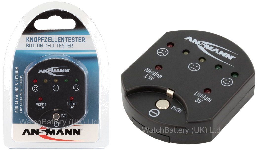 The Ansmann button and coin cell battery tester is a simple to use battery tester for silver oxide, alkaline and lithium button and coin cell batteries. Supplied complete with 1 x CR1620 battery for operation. Simply remove the tag protecting the battery, then place the battery to be tested in the cut-out section at the bottom of the tester and push down to activate. The tester will indicate how much charge is in teh battery bylighting up the coloured LEDs across the top of the tester, from red (nearly discharged) to greeen (fullly charged). It will also indicate the type of battery (alkaline of silver oxide or lithium).