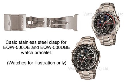 Genuine Casio stainless steel watch clasp for the Casio EQW-500 watch bracelet. This clasp is for the metal bracelet on the following watches: