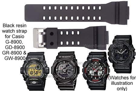High quality replacement black resin watch strap, with satin buckle for Casio G-8900, GR-8900, GD-8900 and GW-8900 watch models as listed below: