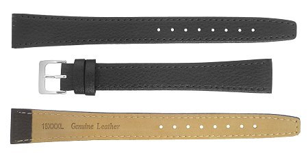 Available in fitting widths of 18, 20, 22 and 24 mm, with colour options black and brown. This is a smooth, matt grained soft leather watch strap, with an option of chrome or gilt buckle.